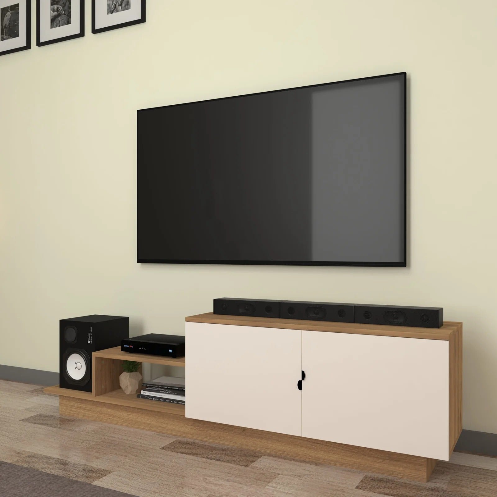 The Lynora TV Stand is a sleek and stylish entertainment unit that combines minimal design with practical storage. Its asymmetrical layout, featuring open shelves on one side and a spacious closed cabinet on the other, makes it a perfect blend of form and function.