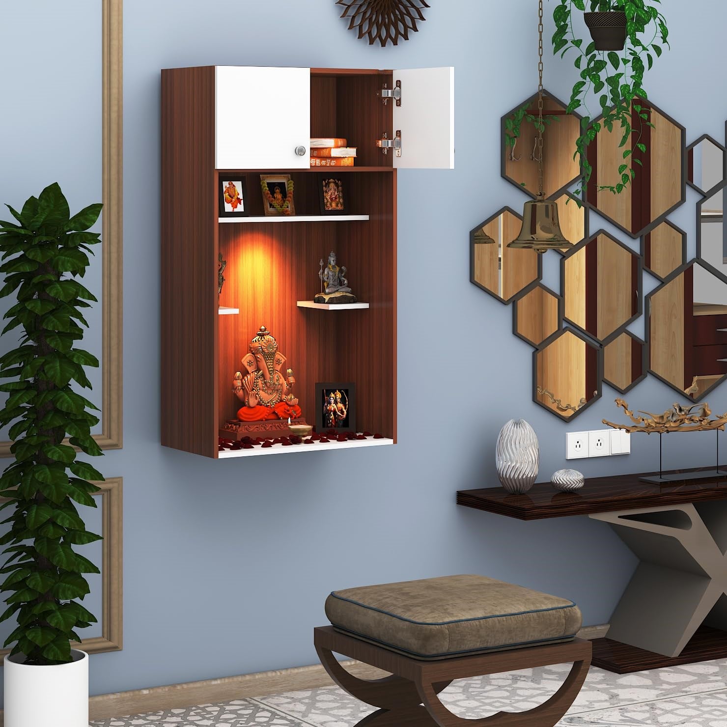 Spacious design ideal for idols and puja setup