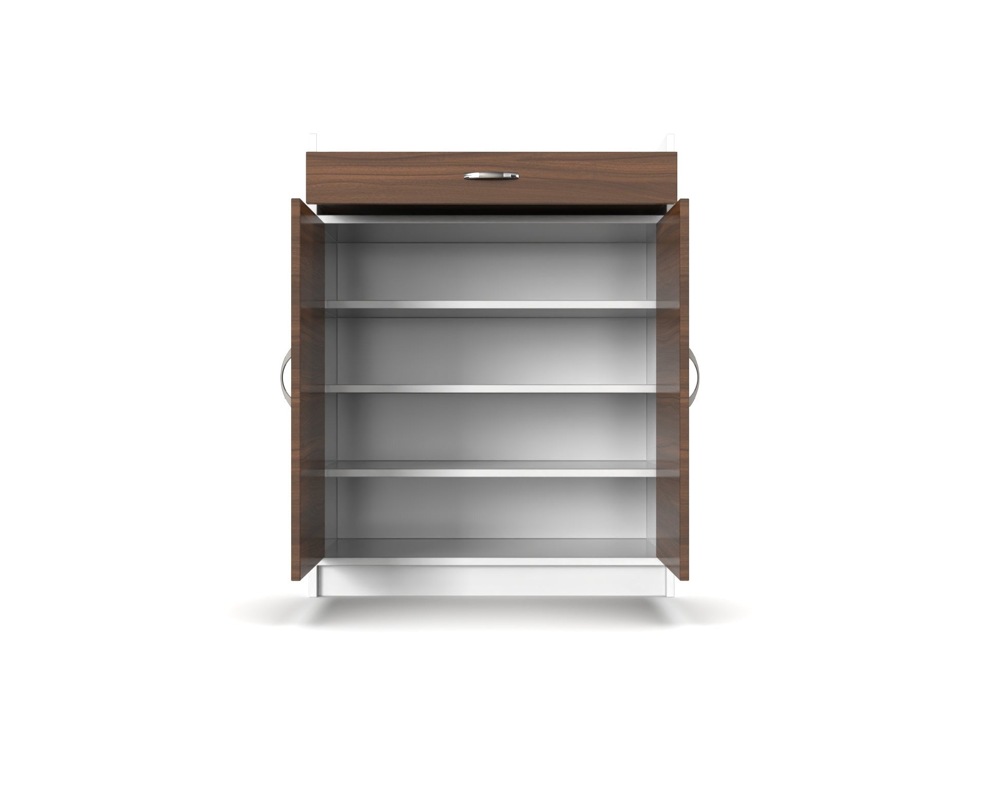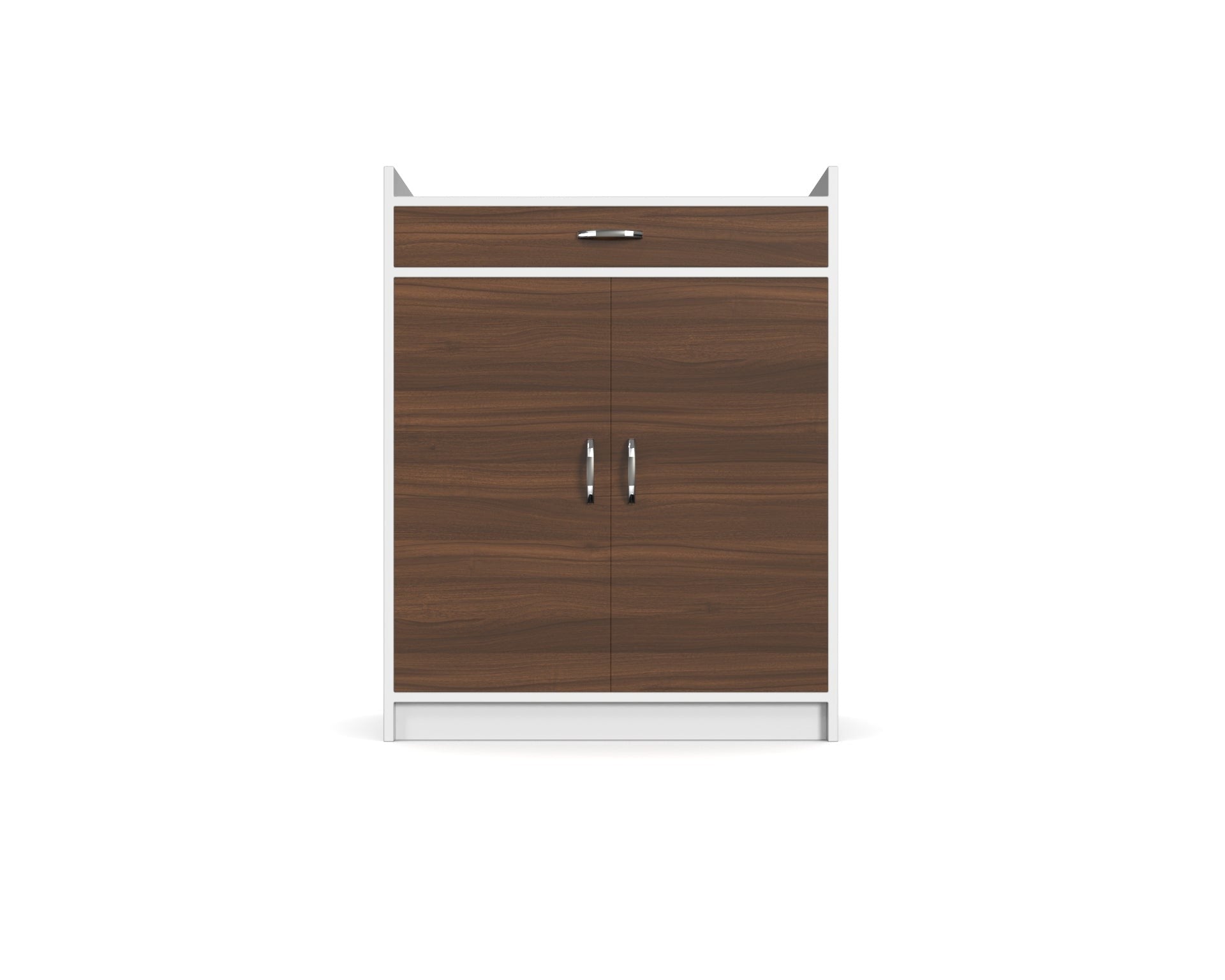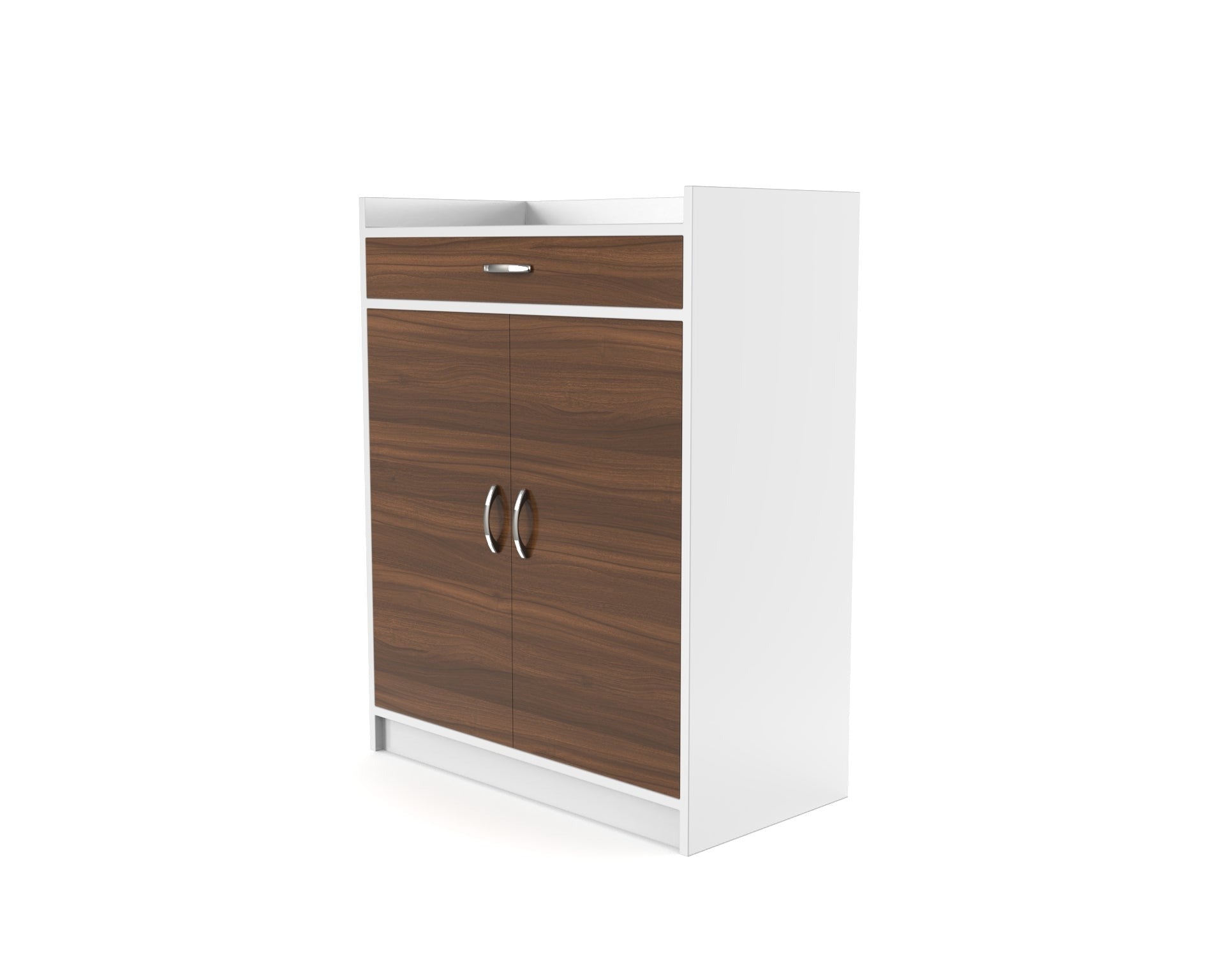 The flat top surface with raised edges provides extra space for displaying décor or keeping daily items handy. Built from premium engineered wood with a modern two-tone finish (white body with walnut doors), this rack is both durable and stylish, blending seamlessly with modern interiors.